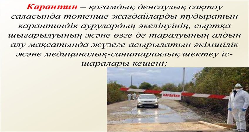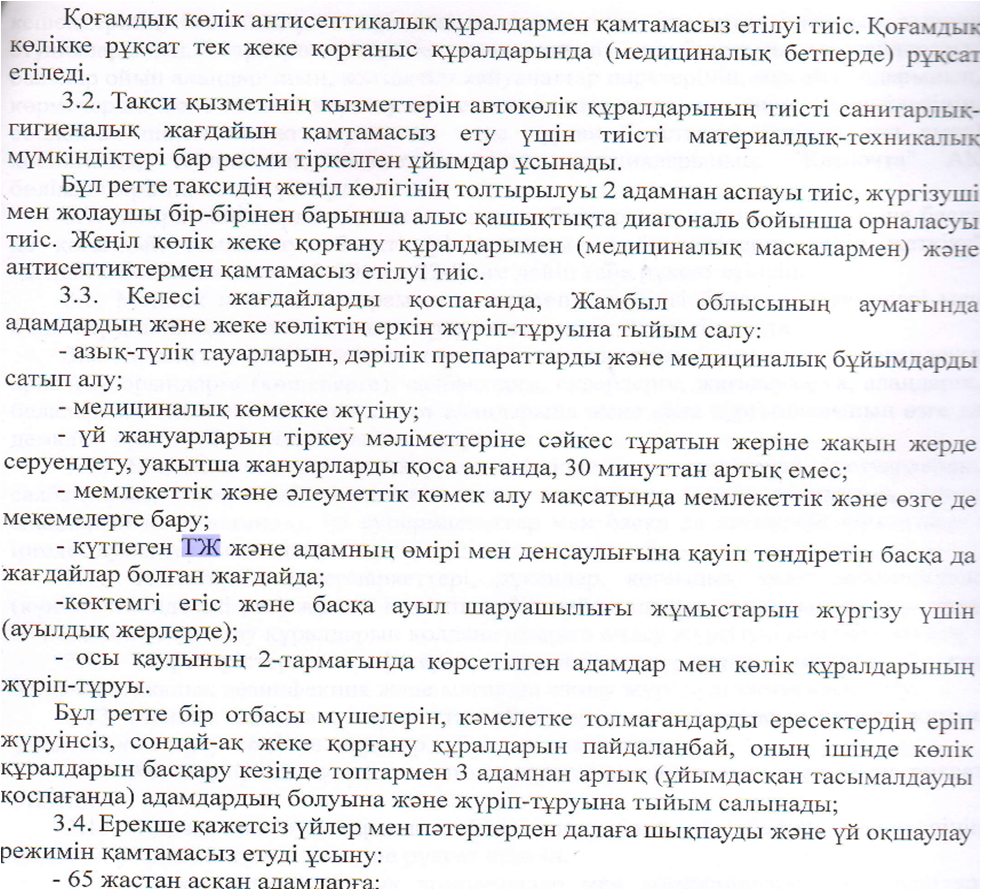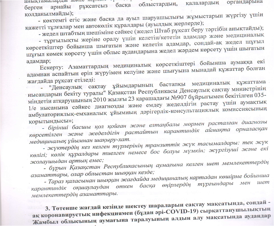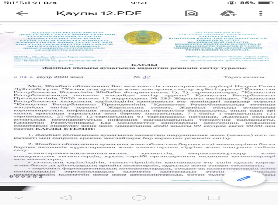 •2020 жылы 7 сәуірде «Жамбыл облысы аумағында карантин режимін енгізу туралы №12 қаулы шығарылды.Карантин режимі 2020 жылғы 9 сәуірде сағат 00-ден басталды.Карантин режимін барлығымыз сақтай білейік !Мемлекетіміз бұл қиындықтан шығу үшін қолдан келгеннің бәрін жасап жатыр.Сондықтан үйде болыңыздар. Елбасымызда осындай қиын сәтте «Бірлесе білген ел бәрін жеңеді» деген үндеуін жариялап,бірлікке шақырып отыр.