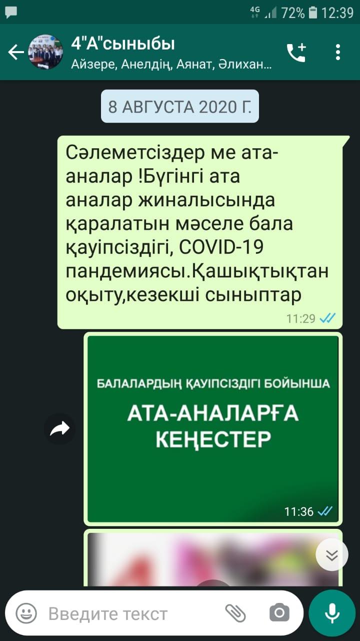 10 август 2020 0 1 2 3 4 5 Ата-аналар жиналысы. 8-тамыз күні 4"А" сынып мұғалімі Керейкулова Ж.К. ата-аналарымен онлайн жиналыс өткізді. Жиналыста бала қауіпсіздігі, COVID-19 пандемиясы,қашықтықтан оқыту және кезекші сыныптар мәселесі қаралды.